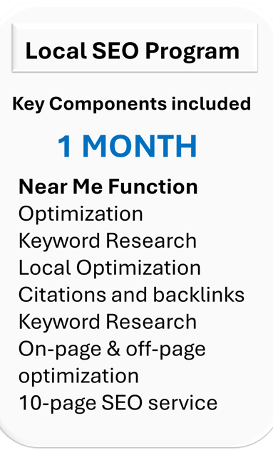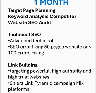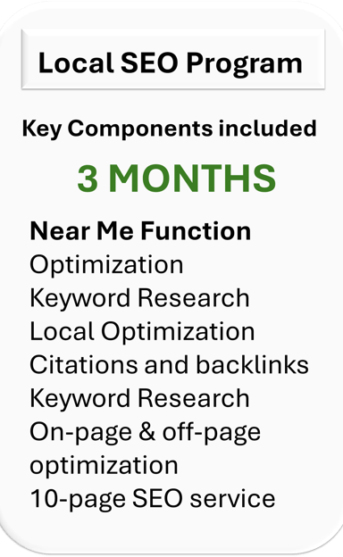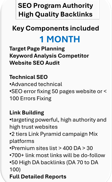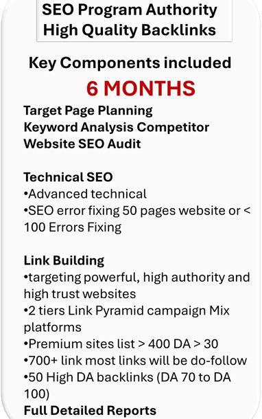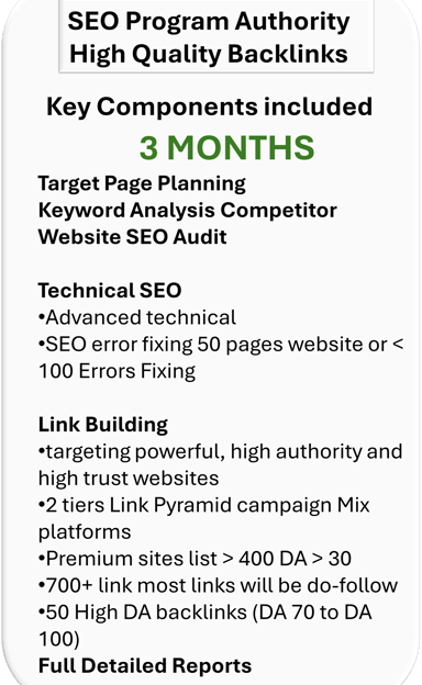 This Premium comprehensive SEO service package benefits your business with improved rankings, increased online visibility, and enhanced local presence. Drives more organic traffic to your site to grow your business effectively, optimized GMB listings, enhanced homepage performance, quality backlinks, engaging articles, and targeted search ads to attract local customers and drive conversions. This service maximizes your online impact and achieves digital success through a strategic combination of SEO techniques tailored to your business needs.
